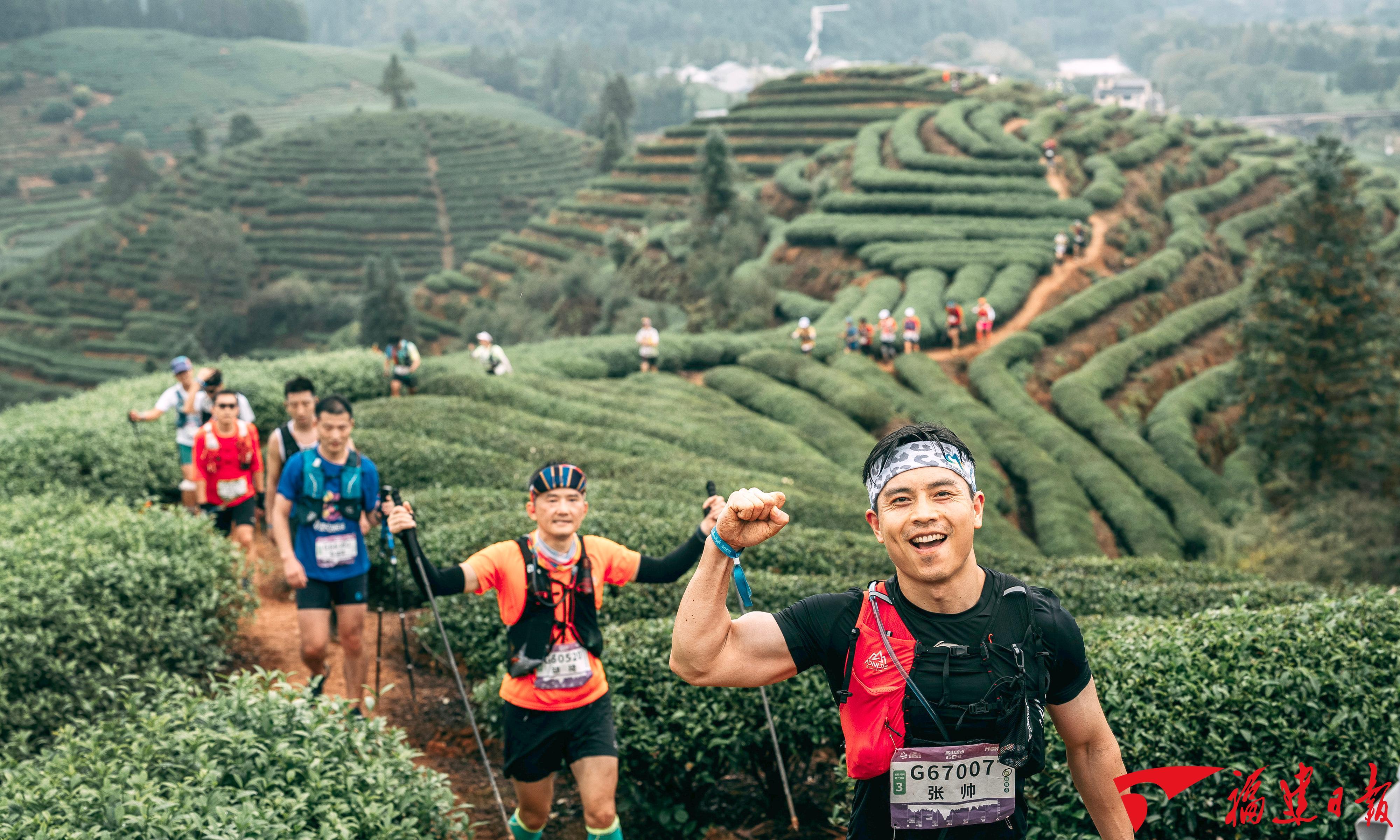 福建“三茶”统筹发展成效显著,茶叶单产水平、茶树良种覆盖率、涉茶国家级农业产业化龙头企业数量领先全国。图为2025年11月9日,跑者们穿行于生态优良的武夷茶山之间。施辰静 摄