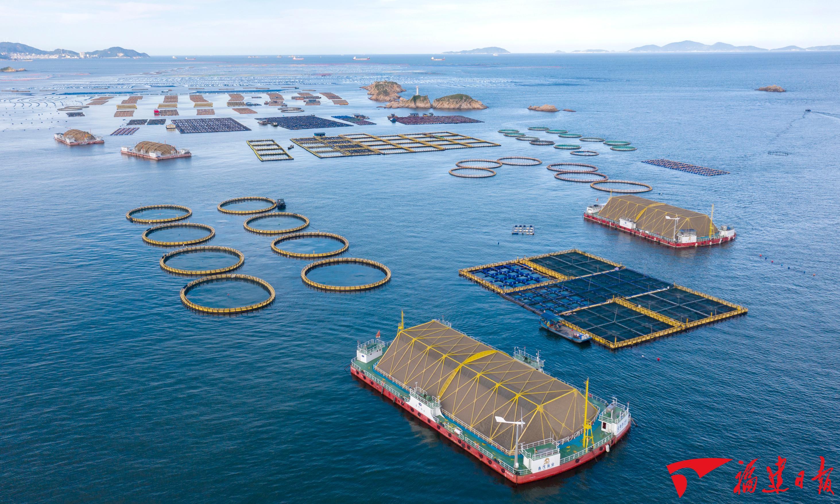 福建大力发展深远海养殖渔场,深远海养殖总体规模全国第一,“海洋牧场”成果斐然。图为2023年6月17日拍摄的连江县定海湾,海面上漂浮着11台套深远海养殖平台。 王毅 摄