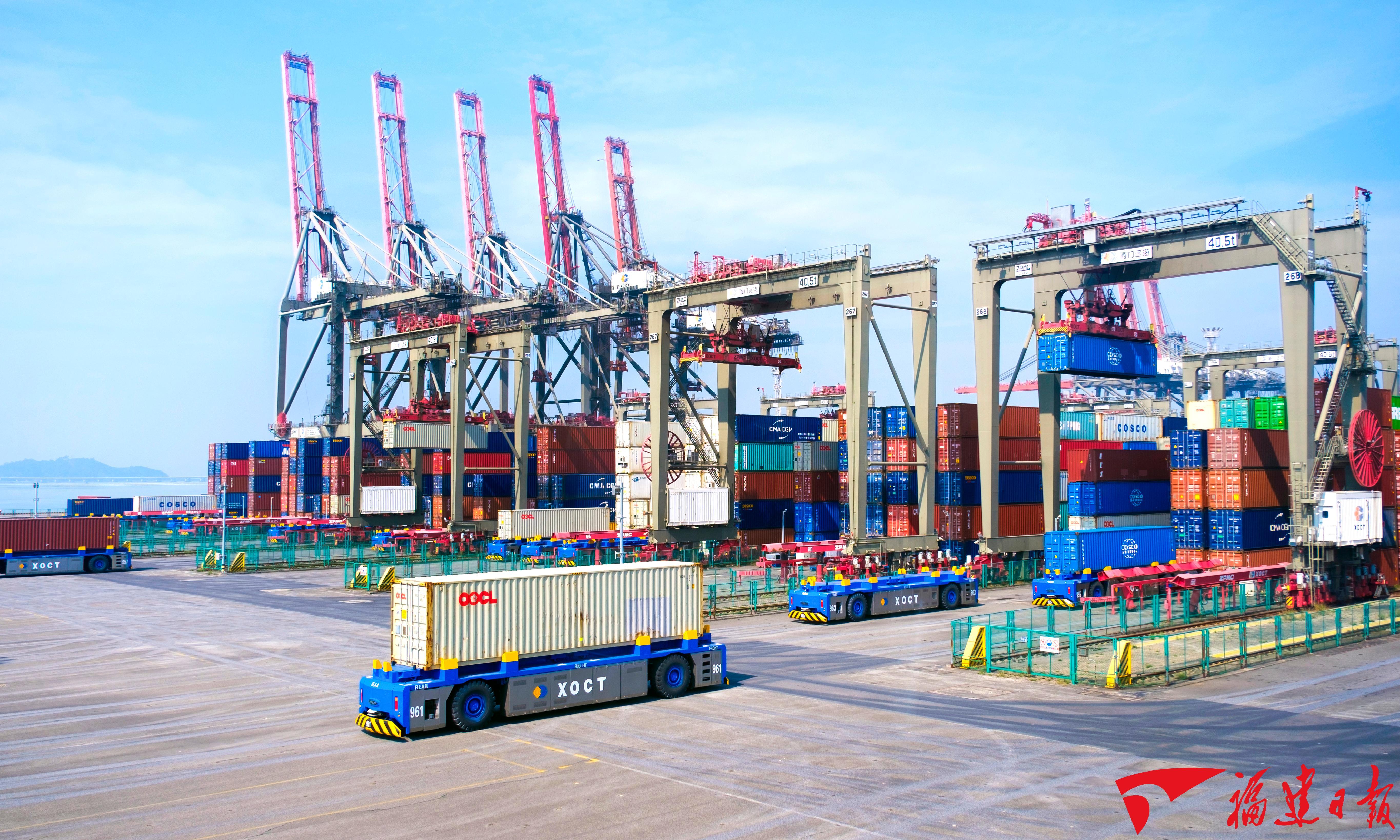 福建港口能级跃升,可常态化停靠世界最大的散货船、集装箱船、邮轮等船型。图为2023年5月25日拍摄的全国首个5G全场景应用智慧港口厦门远海码头。 施辰静 摄