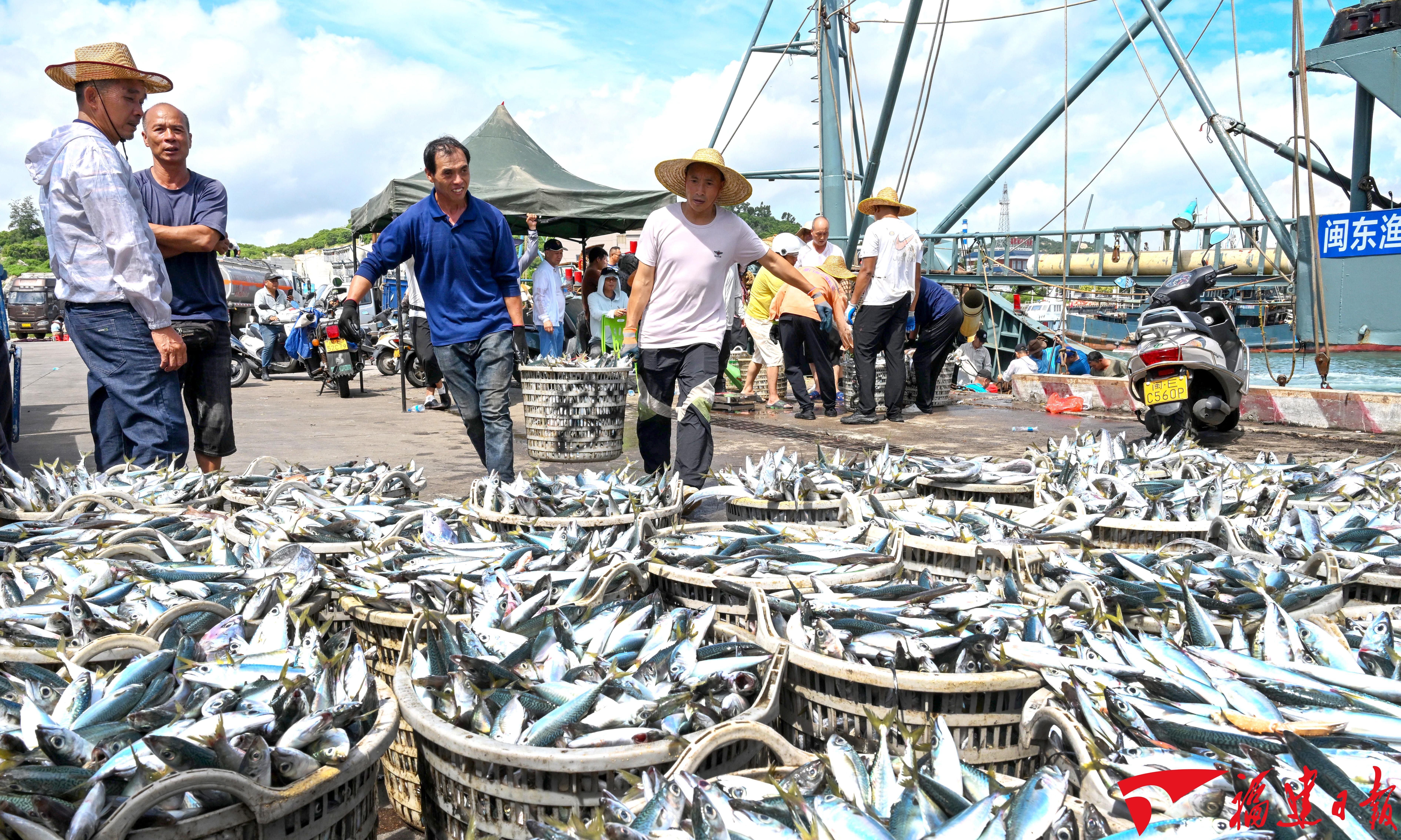 福建因地制宜发展特色产业,做好“海”的文章,加快推动海洋渔业高质量发展。图为2025年8月18日,东山县大澳中心渔港迎回开渔后到港的第一批渔获。 游庆辉 摄