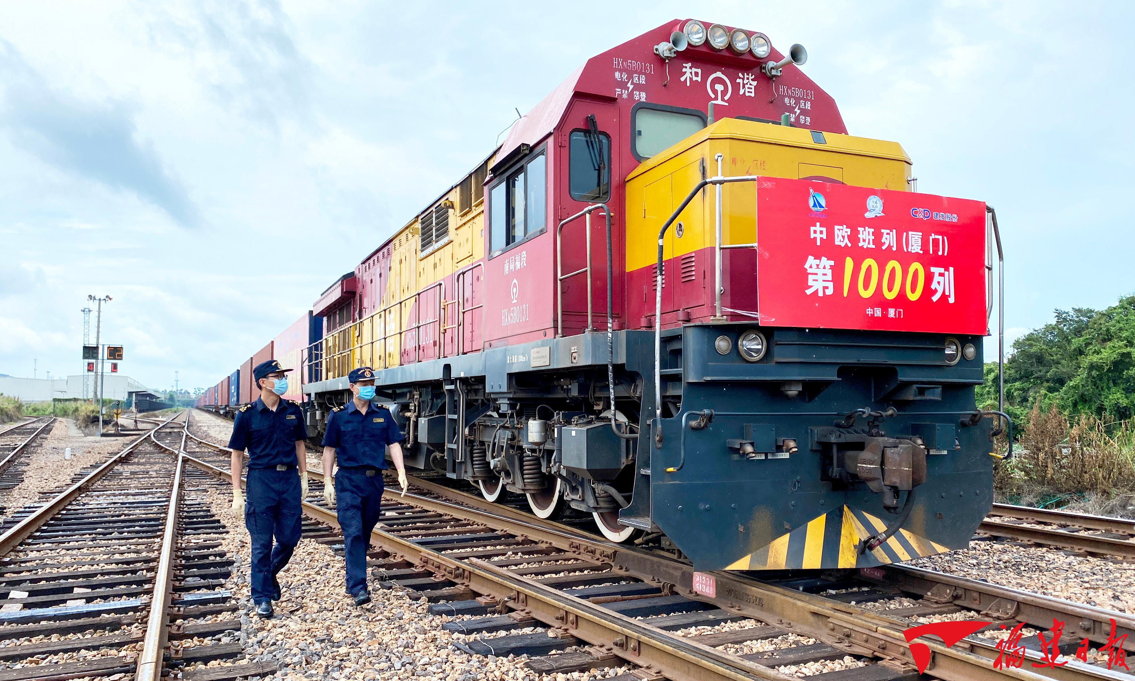 福建把稳外贸作为稳增长稳就业的重要抓手,2024年进出口规模近2万亿元,提前超额完成“十四五”目标。图为2021年6月2日,中欧班列(厦门)累计发运的第1000列班列从厦门自贸片区海沧园区驶向德国汉堡。 施辰静 摄