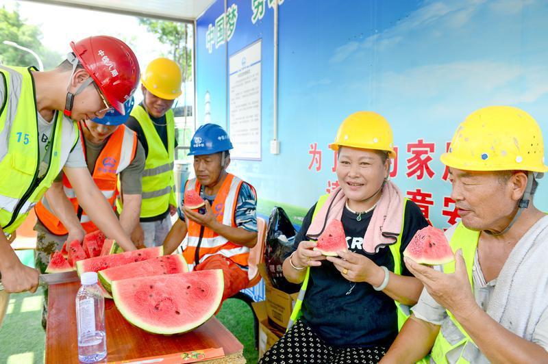 福州市委文明办、市总工会、市城管委、福州晚报联合开展公益送清凉活动。图为工人分享爱心企业送来的西瓜。石美祥 摄