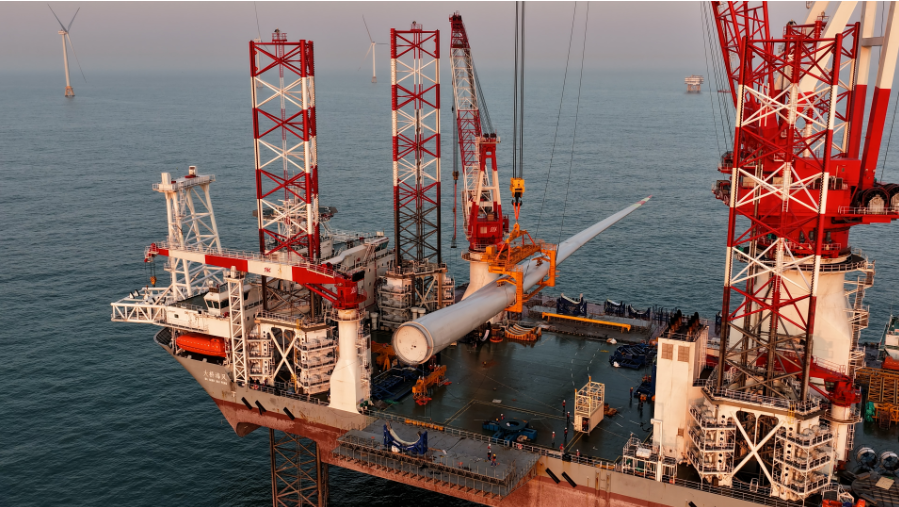 现场,海上风电安装船能抬升船体,以四根桩腿“站立”海中,在风浪中搭出平稳的“空中工作台”。作业人员在此基础上,借助高精度定位及牵引系统实时校准叶片空中姿态,完成叶片与轮毂间毫米级的精准对接与紧固,最终让发电“巨人”迎风而立。