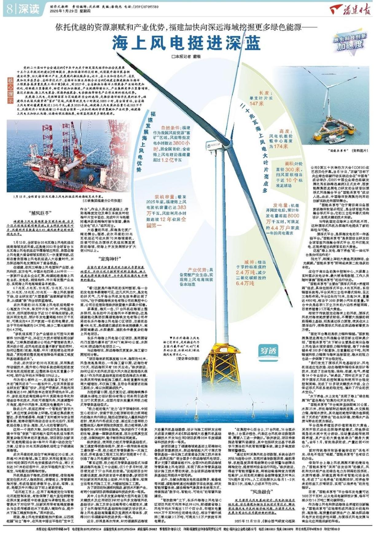 发展海上风电,是保障国家与区域能源安全的选择,是推动海洋经济发展的抓手。福建作为我国风能资源“富矿”区域,风能等效发电小时数达3800小时,居全国首位,全省海上风电理论蕴藏量超过1.2亿千瓦。截至2025年底,福建海上风电装机容量已达383万千瓦,风能利用小时数连续12年位居全国第一。依托优越的资源禀赋和产业优势,福建海上风电正加快从浅海、近海向深远海拓展,向深蓝挖掘更多绿色能源。