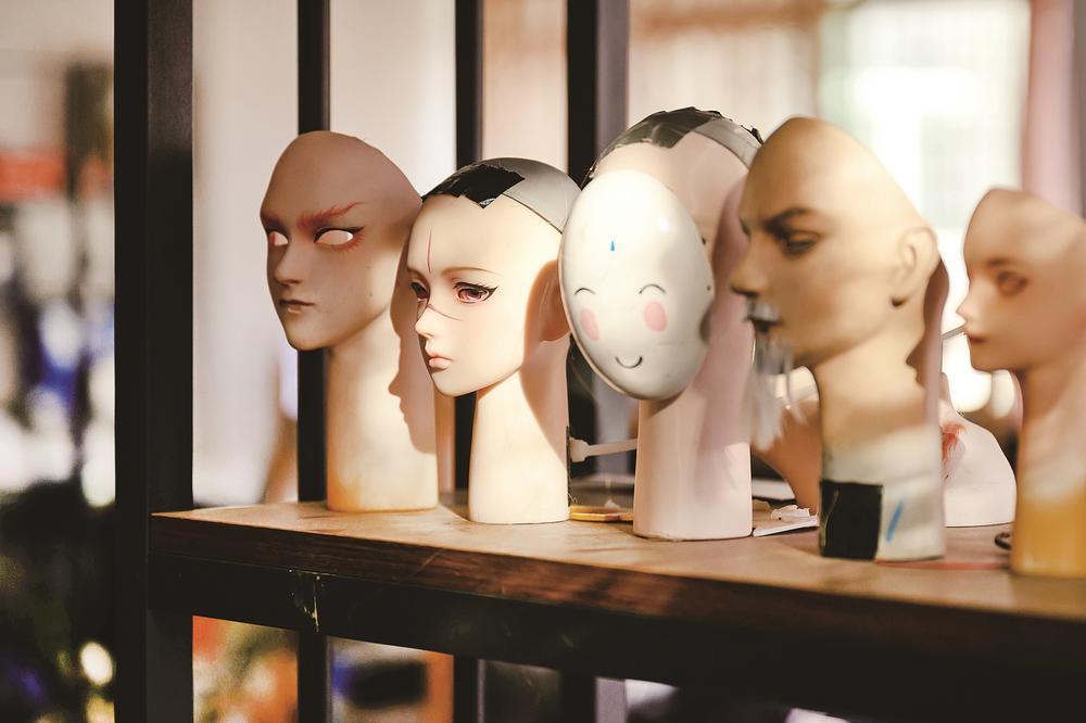 “布袋不呆”的工作室里,架子上摆放着多个造型妆面的戏偶头样品。