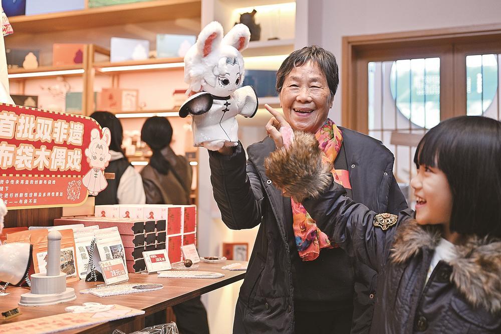 1月1日元旦,漳州“布袋不呆”文创店,根据原创布袋戏情景剧《“生鲜”管理局》中的角色“玉兔”创作的Q版小手偶吸引了一名小游客。