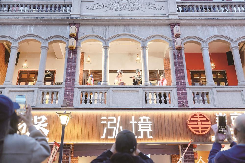 1月1日元旦,“布袋不呆”在漳州古城景区内的一家茶馆+文创集合店挂牌,二楼的布袋木偶表演吸引沿街游客打卡拍照。