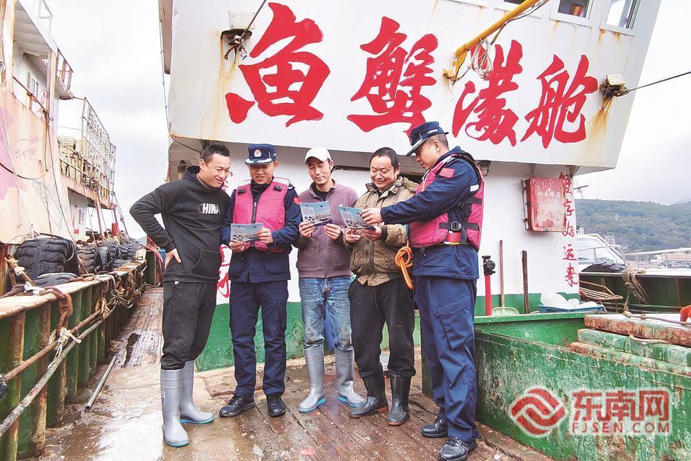东南网2月1日讯(福建日报通讯员 吴宗伟 记者 张文奎 摄)在《中华人民共和国海警法》颁布实施五周年之际,1月31日,福州海警局精心组织开展了以“学习海警法,共护蓝色家园”为主题的系列宣传活动,进一步提升社会公众对海警职能的认知和海洋权益保护意识。图为在连江县黄岐渔业码头,福州海警局连江工作站执法员登上渔船开展普法宣传活动。