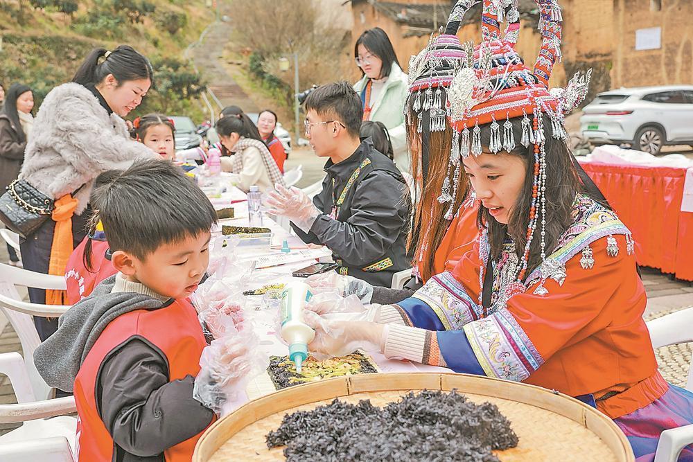 近年来,廉岭村立足畲族文化特色,通过系列文旅活动,推动“文化+旅游+体育”融合,使古村焕发新生。图为孩子体验乌米饭制作。
