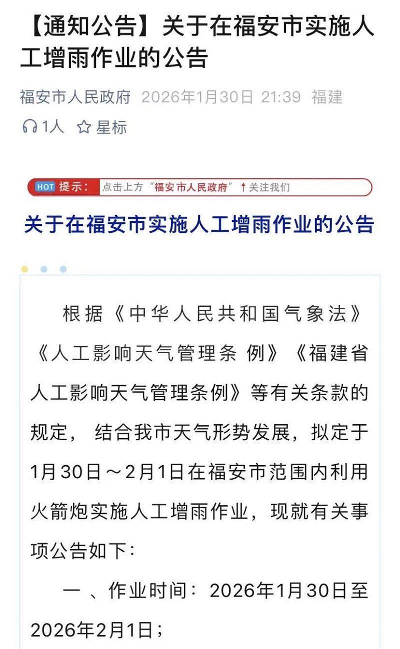 福安市发布实施人工增雨作业的公告。网络截图。