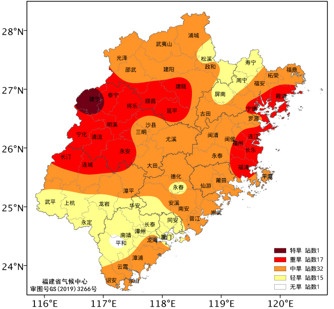 2月1日气象干旱综合指数监测显示:全省大部出现中旱及以上气象干旱,其中较严重区域出现在南平南部、三明西部、龙岩北部及中北部沿海地区,全省共32个县(市、区)城区为气象中旱,17个为气象重旱,建宁为气象特旱。