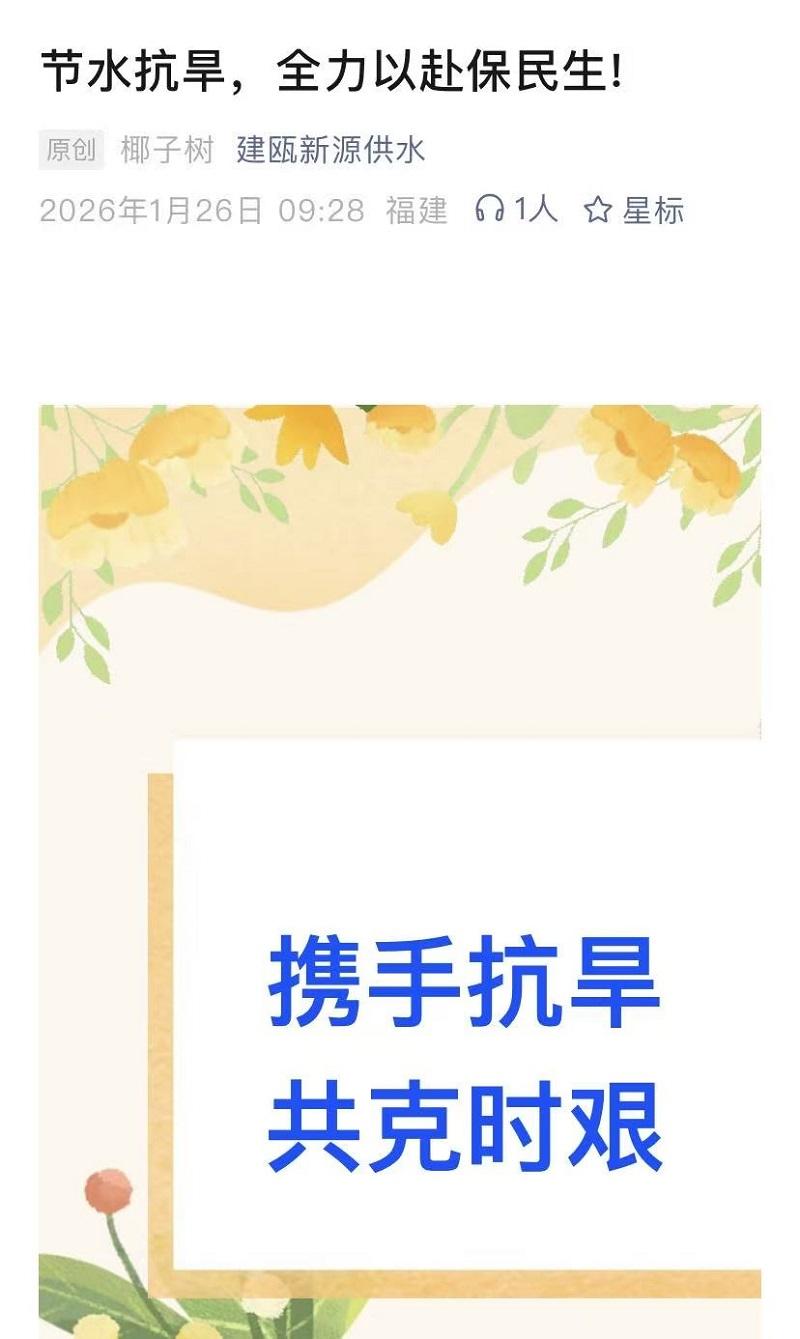 建瓯市新源供水有限责任公司提倡节水抗旱。网络截图