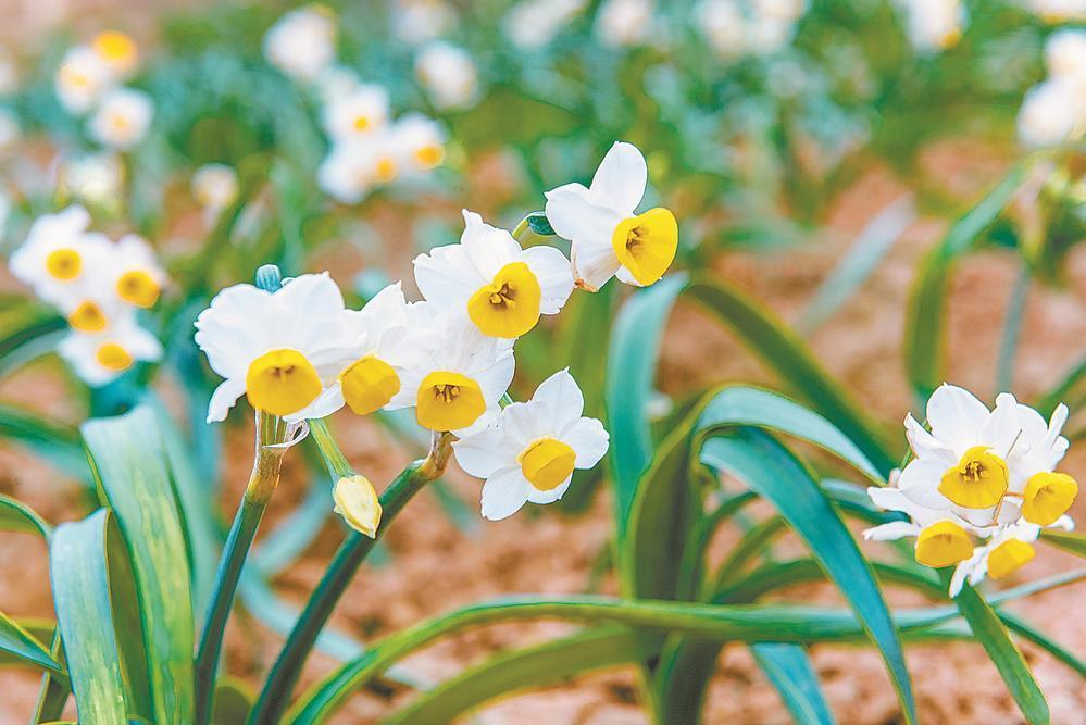 深冬时节,记者驱车来到君山片区西大宛村水仙花种植基地,只见田垄间一株株水仙花迎风挺立,连成一片盛大的花海,引得游客前来拍照打卡。