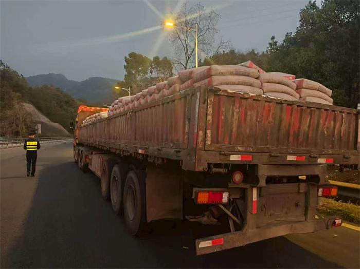 行动期间,执法人员在福银高速公路将乐收费站入口开展执法检查时,查获一辆豫P牌照重型半挂牵引车未采取必要措施防止货物脱落、扬撒行为。经查,该车运载袋装水泥,货物装载高度超出车辆挡板约30厘米,未采取任何防护措施,存在货物脱落、扬撒的安全隐患,其行为涉嫌违反《中华人民共和国道路运输条例》相关规定。