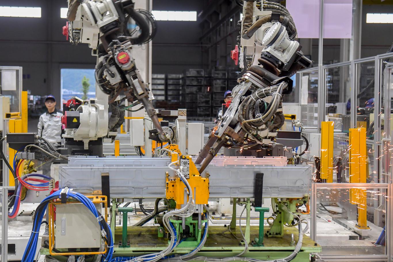 福建丸顺新能源汽车科技有限公司智能生产车间,机械臂对产品进行焊接。
