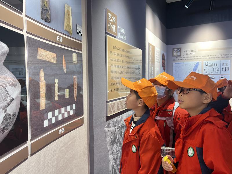 目前,黄瓜山遗址公园已开放黄瓜山遗址展厅、研学基地,开展模拟考古、黄瓜山海错等形式多元的文化教育活动,让人们多角度感受黄瓜山文化的独特韵味。自2024年10月运行至今,研学基地共开设考古探秘、化石手作、陶艺制作等10多种研学课程,接待服务中小学生、游客5000人次。
