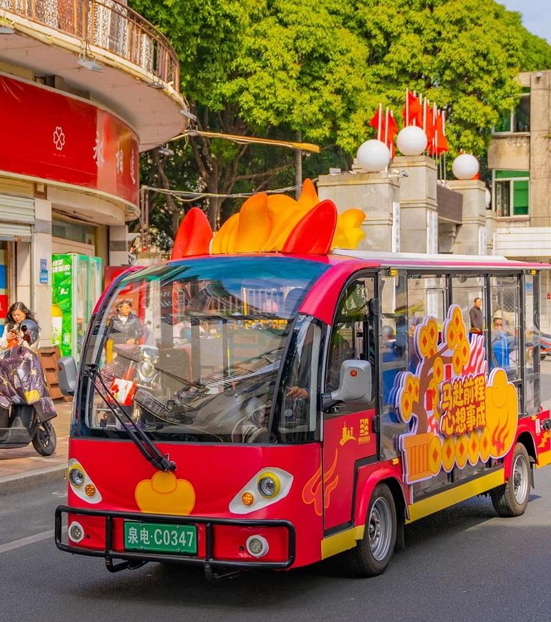 泉州古城小白车。图片来源:泉州公交 泉州推出“六免”措施,市县联动推出免费停车、免费公交、免费接驳、免费奉茶、免费看戏、免费讲解等暖心服务,春节假日9天,中心市区131条公交线路全部免费,古城“小白”公交车全部免费,全市提供超2.4万个免费停车位。同步开通6条免费公交接驳专线,中心市区设置5处免费停车接驳点。