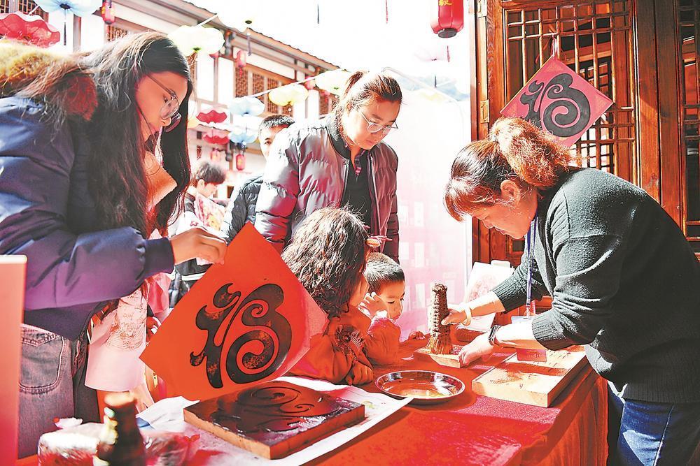小朋友体验木刻印刷“福”字。通讯员 王英德 福建日报见习记者 李子衡 摄