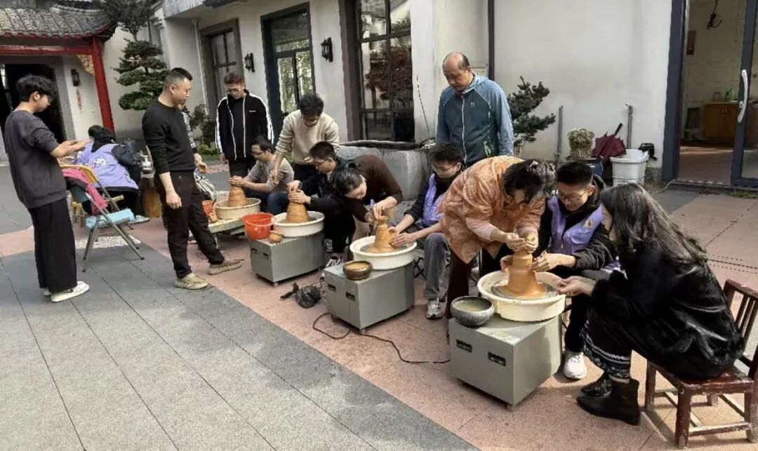 上手体验方知传承之艰。在黄美金四合院,在黄文勇老师及其徒弟的亲授指导下,亲身参与建盏拉坯体验。揉泥要匀、定心要稳、拉高要缓、修形要准,每一步都是手、眼、心的三重奏,在泥坯上谱写无声的乐章,看似简单的动作,实则考验着极致的耐心与手感。 正如大师在讲座中所说:“一只好盏,要经得起千揉百炼。” 队员们反复尝试,指尖沾满瓷泥,于一次次调整打磨间,真切体悟到传统制瓷工艺的艰辛,更对大师们“精益求精、百折不挠”的工匠精神肃然起敬。