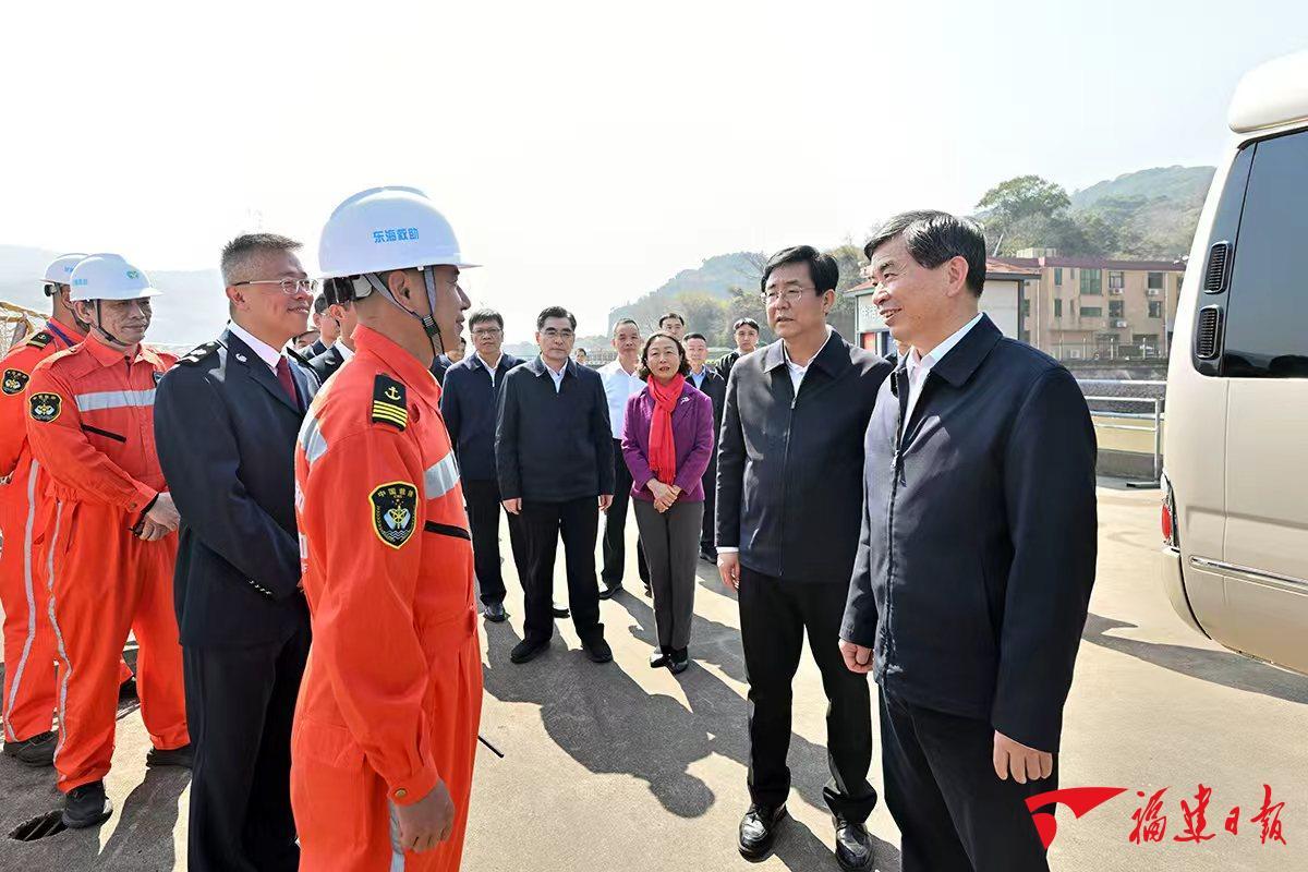 交通运输部东海救助局福州救助基地,承担着辖区内人命救助、环境救助、财产救助和应急抢险打捞等急难险重任务。周祖翼、赵龙详细听取了福建涉海涉水重大任务应急保障工作介绍,并登上救助舰艇,察看救助船只和航空器,了解海上值班排班专业力量部署、应急处置预案等情况,感谢基地长期以来为辖区海上平安和新福建建设作出的贡献。周祖翼希望大家立足福建海域特点,强化预警研判、协同配合,开展实战训练,提升救援能力,以更高标准做好海上救助、守护海域安全,助力福建高质量发展。