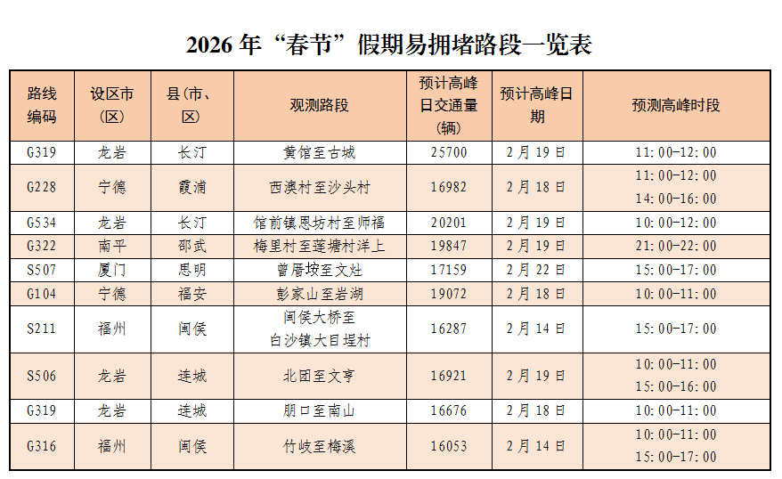 预计“春节”假期全省普通国省干线易拥堵路段将主要集中在龙岩、福州、宁德等地区。