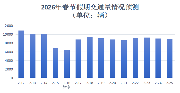 2026年“春节”放假时间为2026年2月15日至2月23日,共9天。根据全省现有交通量观测站的往年数据预测,2026年“春节”假期全省普通国省干线日均交通量9320辆,较上年同期上升2.8%。