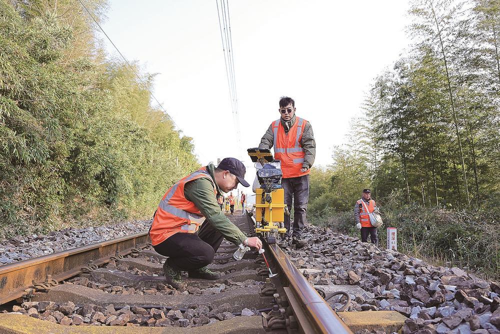 近日,中国铁路南昌局集团有限公司南平工务段的探伤工们坚守在峰福铁路线上,对钢轨及焊缝进行细致检测,确保列车运行安全。这些橙色身影在寒风中步行数公里,日均行走超2万步,用责任与专业守护着万千旅客的归途安全,被称为钢轨的“守护神”和“B超师”。图为探伤工在钢轨伤损处打上标记。福建日报记者 张颖 通讯员 吴志祥 摄