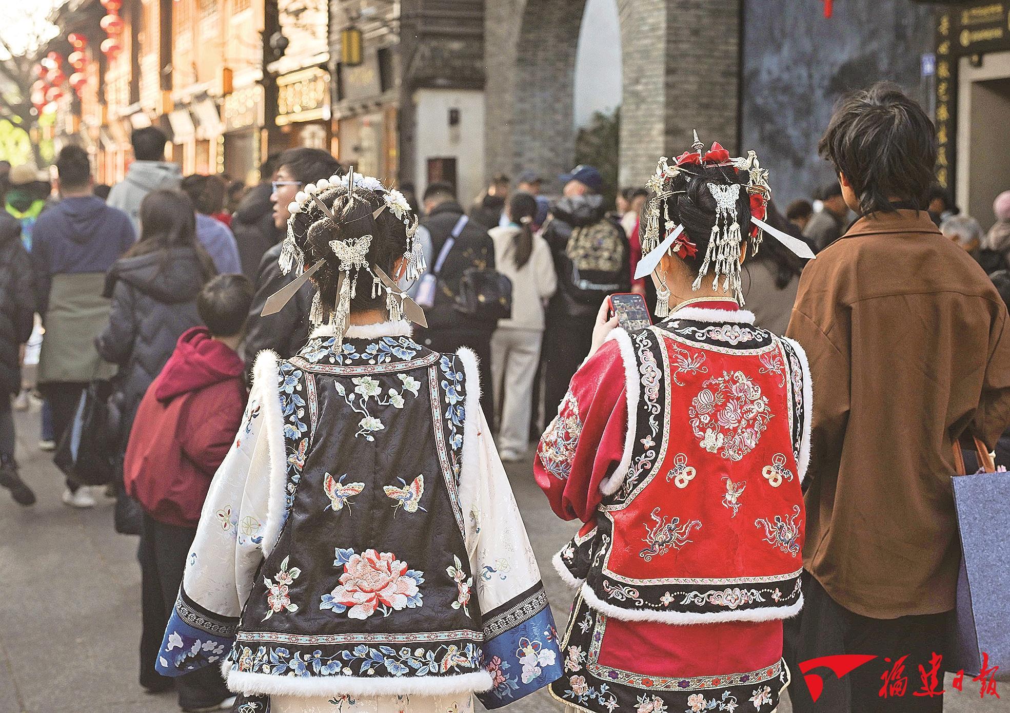 头戴“三条簪”的游客在福州三坊七巷游玩。福建日报记者 游庆辉 摄