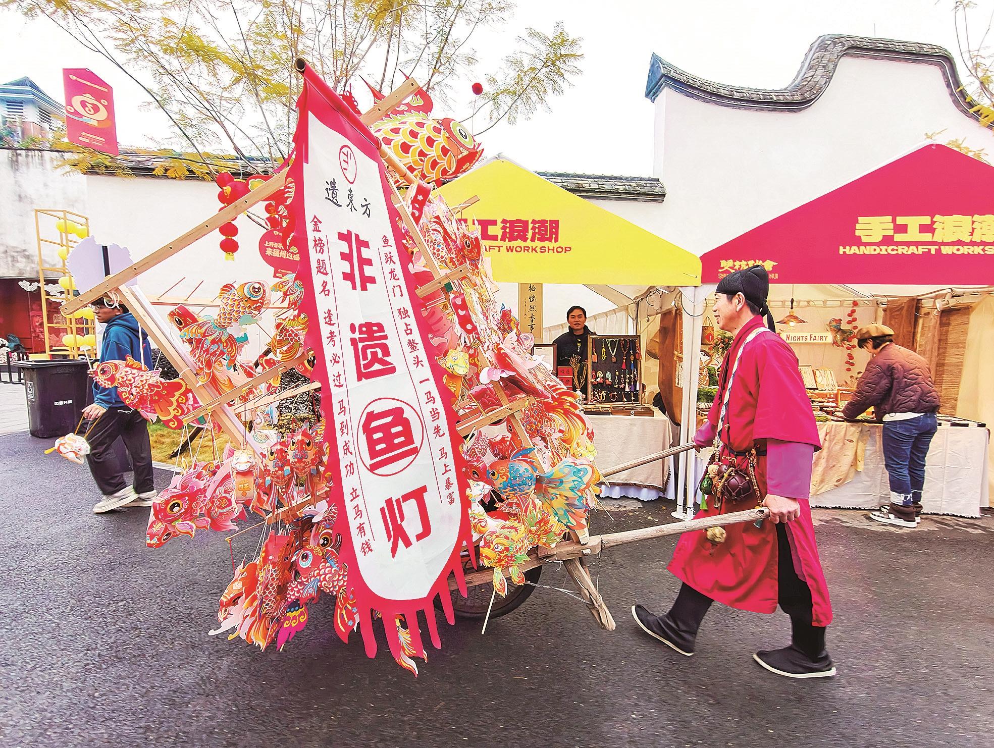 在福州上下杭历史文化街区,商贩售卖非遗鱼灯。 谢贵明 摄