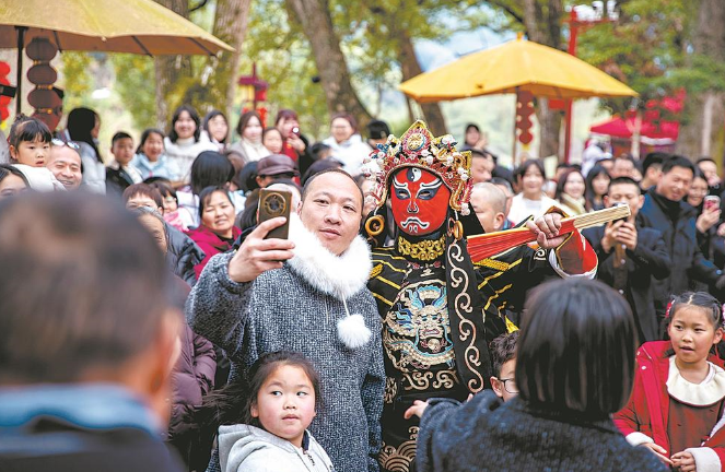 17日,南平市松溪县梅口埠景区新春嘉年华活动启幕。图为游客与变脸演员合影。福建日报通讯员 周燕兰记者 陈黎慰 摄