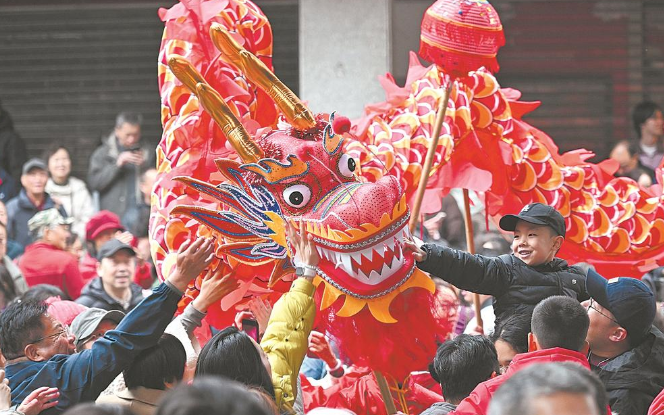 17日,福州南后街热闹欢腾,舞龙、醒狮表演精彩绝伦。图为游客争相摸龙头沾福气。福建日报记者 游庆辉 实习生 洪昊扬 摄