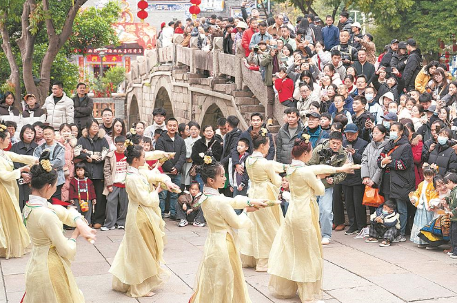 17日,福州上下杭景区文艺演出吸引了大量游客。福建日报记者 王毅 摄