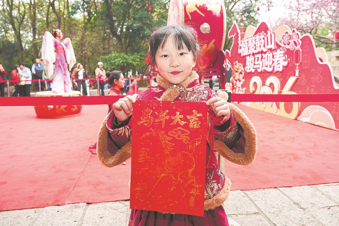 17日,福州鼓山旅游景区推出“福聚鼓山 骏马迎春”新春非遗嘉年华。图为小游客展示年画。福建日报记者 游庆辉 实习生 洪昊扬 摄