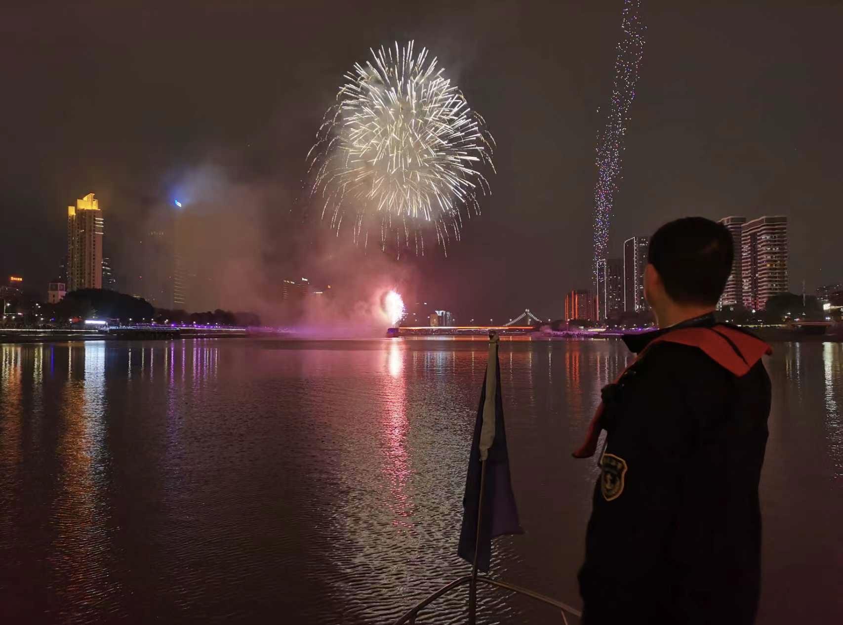 活动当晚,福州海事部门调派多艘海巡艇,并协调海渔执法船艇在核心水域现场警戒守护。执法人员全程驻守,精准管控船舶动态,科学引导入场船舶按计划驻位,确保燃放区域及周边水域安全有序。