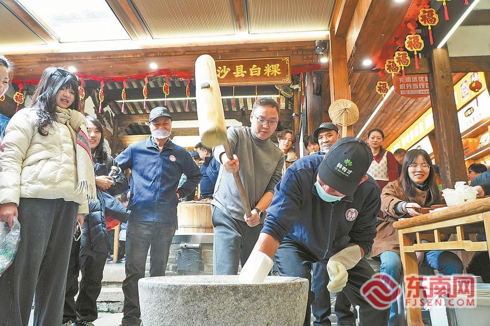 如今,这份凝聚着家族情感的“年味”正随着时代春风悄然蔓延至更广阔的天地——春节期间,沙县东门古街游人如织,在醉有才大食堂,“打白粿”“捶扁肉”体验区排起了长队。来自天南海北的游客好奇地举起木槌,尝试捶打石臼中的米团;孩子们则用力按压着模具,制作属于自己的“福”字白粿。“咚咚咚”的捶打声与欢声笑语交织,传统技艺摇身一变,成了可体验、可共享的文化景观。