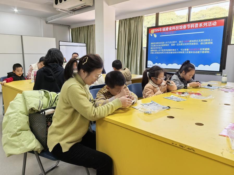 在福建省科技馆二楼的“机械创想家”科学工坊里,孩子们在学习红外避障机器人的工作原理后,认真动手组装零件,亲手制作属于自己的“避障机器人”,每一个环节都在培养孩子们的专注力和动手能力。活动期间每日上午开设一场主题不同的机器人组装实践活动,让青少年探索红外传感、仿生结构、声音控制与自平衡等核心科学知识,亲手打造简易机器人,在趣味实践中培养空间思维与动手解决问题的能力。