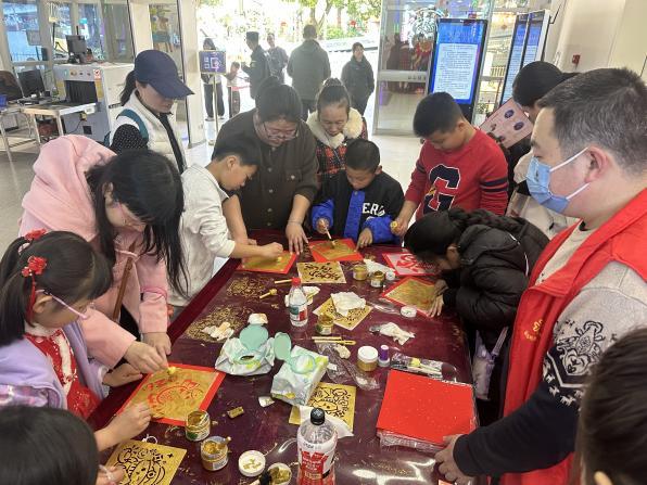 走进福建省科技馆,“新春拓福”展区映入眼帘,满目中国红烘托出浓浓的节日气息。孩子们在工作人员引导下体验传统拓印:手持拓包蘸取墨汁,均匀涂抹,金色的纹样渐渐浮现在红纸上。完成的作品被贴在祈福展板上,孩子们捧着自己的“福”字,笑逐颜开。