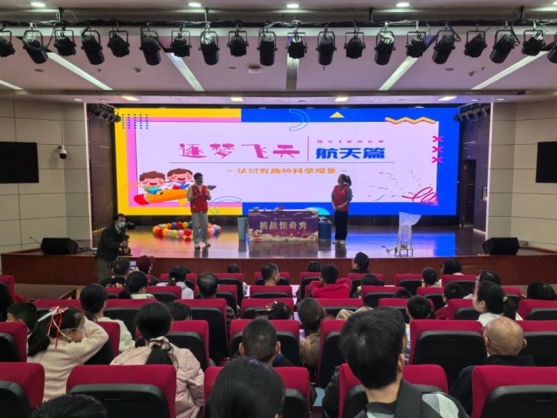 二楼报告厅座无虚席,轮番上演两场科学表演,在“逐梦飞天”表演中,科技辅导员通过有趣的科学实验模拟火箭升空,带领观众认识我国的航天器,了解航天航空存在的科学原理;“砰砰!科学奇趣秀”表演现场,科技辅导员通过空气炮、液氮大炮、伯努利炮等实验,生动展现压力与气体性质的奥秘。“燃烧吧!科学”与“光影魔术师”等科学表演同样精彩,科技辅导员借助静电、燃烧、气体特性、火焰与光影等原理设计实验,以直观震撼的方式呈现科学奥秘,现场欢呼声不断,掌声此起彼伏。