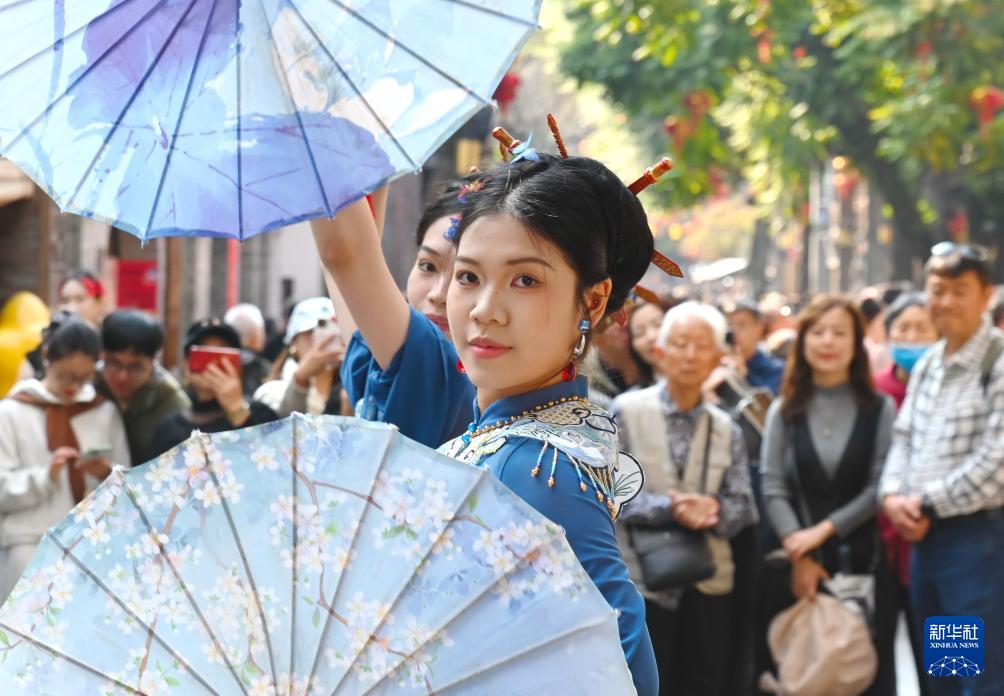 2月22日,演员在福州三坊七巷的南后街牌坊前表演国风舞蹈。