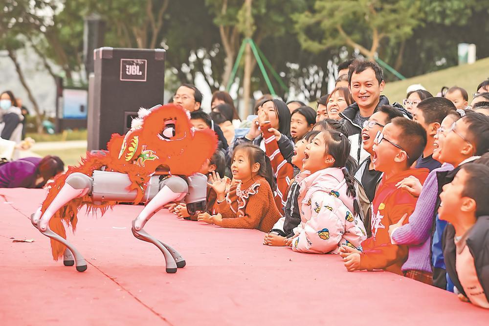 23日,在福清市石竹山风景名胜区,游客与智能机器狗互动。当日,景区举办机器人热舞、汉服巡演、欢乐成语接龙等活动,以“科技+非遗+百业”等形态,吸引市民游客前来观赏。谢贵明 摄