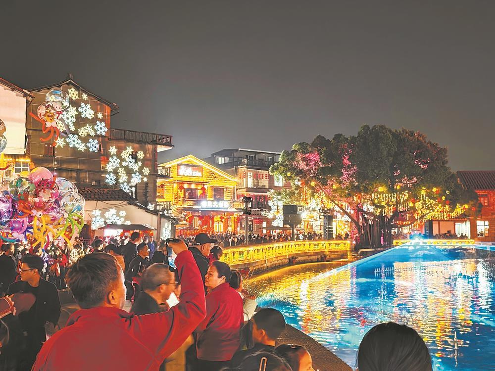 东南网2月24日讯(福建日报报业集团记者 林爱玲 通讯员 林亦霞)福船静卧,喷泉起舞,光影在红砖骑楼上流转……春节期间,莆田市涵江区萝苜田历史文化街区灯火璀璨,人流如织。水心河两岸人头攒动,璀璨灯火勾勒出古厝轮廓,音乐喷泉随律动起伏,水幕光影投射在“兴涵号”福船帆面,演绎着水韵涵江、民俗风情与城市新貌。