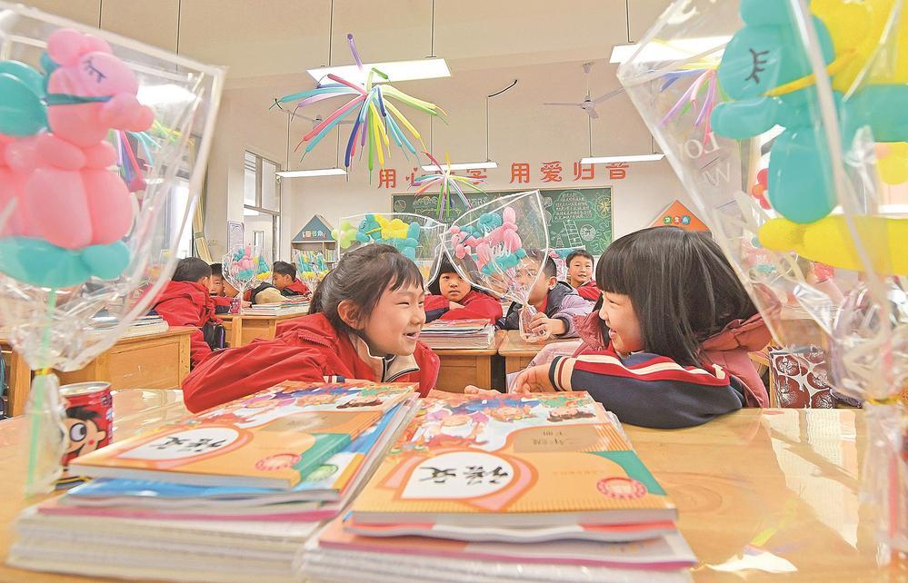 26日,福建师范大学泉港实验小学迎来开学第一天,同学们在布置一新的教室里分享新春趣事。福建日报通讯员 林弘梫 摄影报道