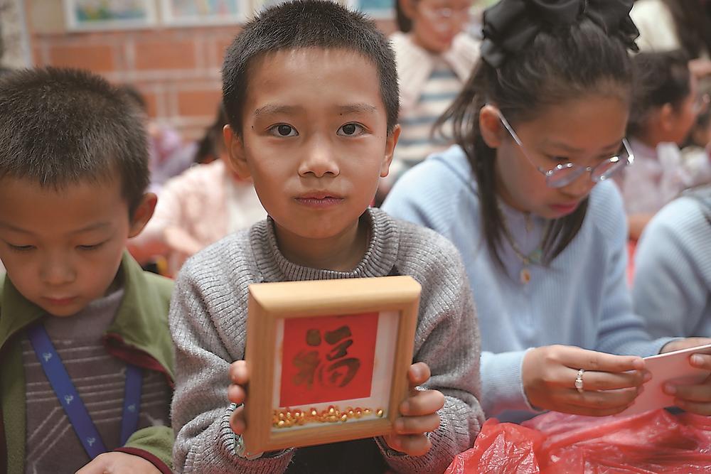 图书馆举办的寒假活动中,孩子展示DIY的马年“福”字框。(受访者供图)