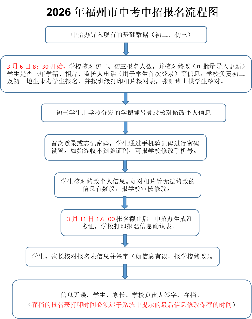 2026年福州市中考报名(含初三中考报名、初二/初三地理生物学业统一考试报名、中考体育报名)将于2026年3月6日8:30-3月11日17:00进行。报名截止后,学校打印报名表给学生确认报名信息并签字;补报名时间是4月22日8:30-4月24日17:00。