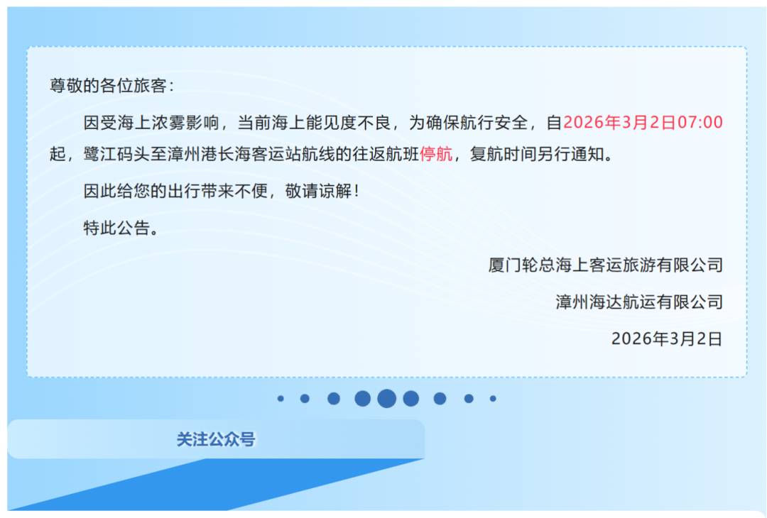 自2026年3月2日07:00起,鹭江码头至漳州港长海客运站航线的往返航班停航。