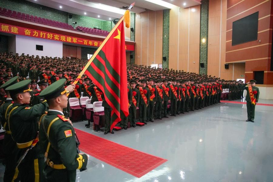 退役士兵向武警部队旗庄严宣誓。