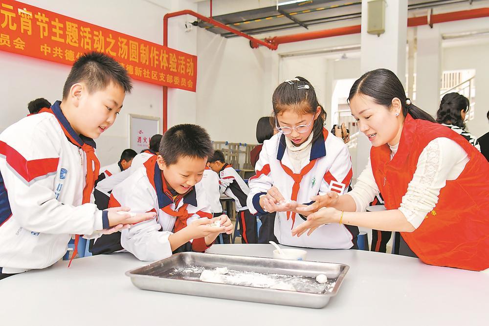 2日,德化县实验小学举办汤圆制作体验活动,孩子们在老师的带领下制作汤圆,用小手揉出“团圆味”。福建日报记者 汤海波 通讯员 许华森 摄