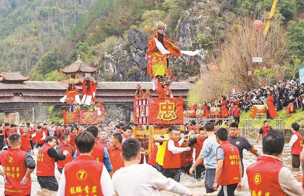 3日,龙岩市连城县罗坊乡走古事现场锣鼓震天,乡亲们抬着400余斤的古事冲入青岩河,呐喊着踏浪逆进。福建日报通讯员 池啟浪 见习记者 李娟 摄