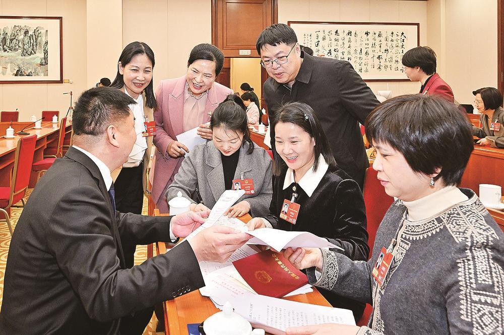 4日下午,参加十四届全国人大四次会议的福建团代表按法律规定讨论和提出议案、建议。