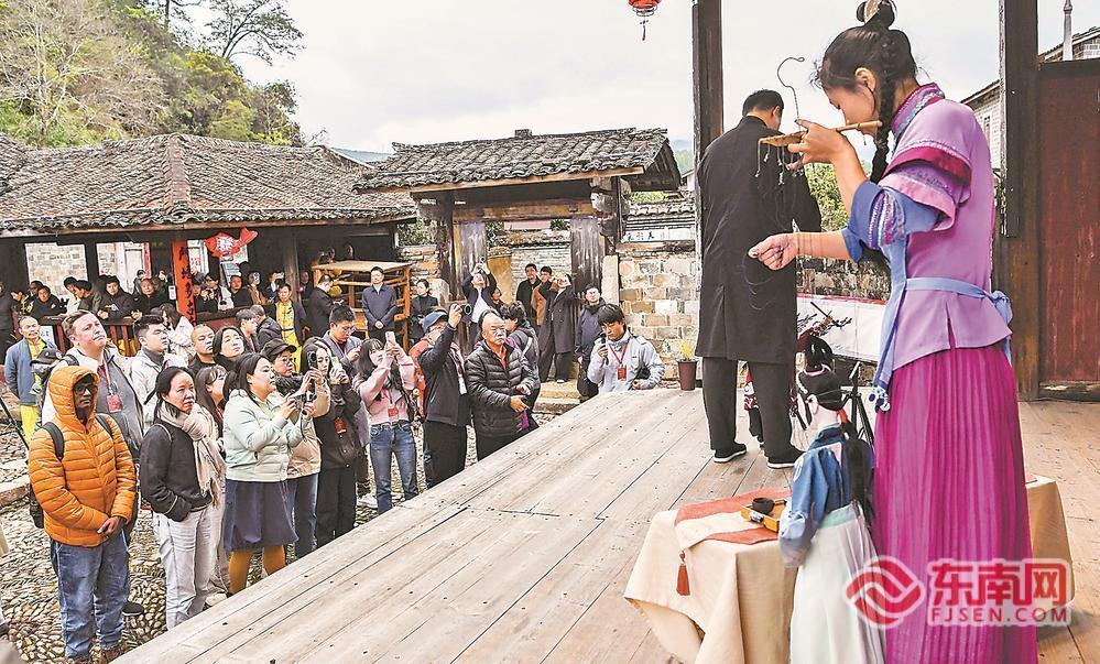 3月3日至4日,由国务院新闻办公室主办、福建省委宣传部承办的“感知幸福中国福建行”主题参访活动走进龙岩。来自境内外的媒体记者和网络达人组成参访团,循着客家文化与传统村落的脉络,在乡野与土楼间行走,在民俗与光影中对话,感知一座山城的文化厚度与生活温度。图为参访团在欣赏连城提线木偶书法表演。